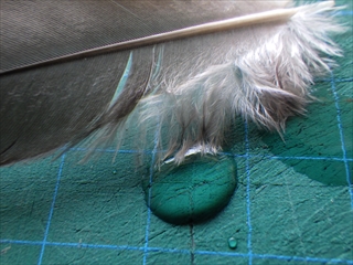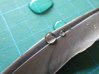 次は、翼の羽根で実験。羽根に水を垂らしてみます。