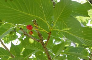 帰真園には何種類もサクラの仲間がありますが、こちらはオオシマザクラ。葉っぱが大型で産毛がなく、「桜餅」の材料になります。さわってみると・・・なるほどつるつるしています。黒く熟した実を鳥たちが食べている場面に出会うことも。今日の実はまだ苦そうですね。