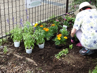 22日(水)に、植え替え作業を行いました。昨年から始めたチョウを呼ぶための花壇づくりを継続しつつ、こどもたちも楽しめる花を植えました。土を掘るとミミズがでてきたり、水やりをするとアズマヒキガエルがでてきたり、花苗を植える前からモンシロチョウが飛んでいたりと、様々な生きものたちに出会うこともできました。