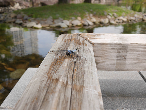 帰真園では秋にかけて、さまざまな種類のトンボに出会えます。じっとしていると、近くに止まってくれるかもしれません♪