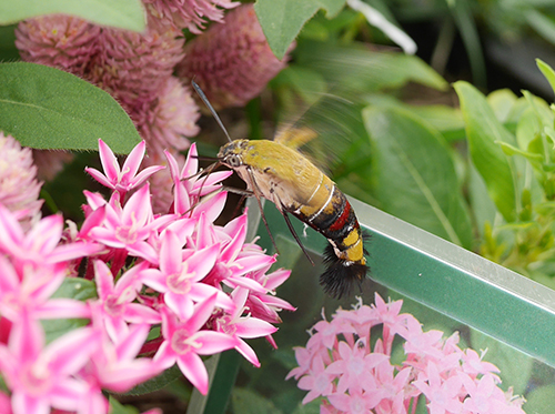 帰真園を出てナチュモコガーデンに向かうと、オオスカシバが花の蜜を吸っていました。