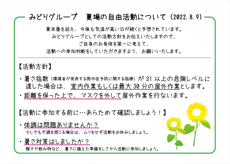 【みどりグループ】 夏場の自由活動について Tweet 暑さ対策として、みどりグループの夏場の活動方針をお伝えいたします。内容をご確認いただいた上で活動への参加判断をしていただきますよう、よろしくお願いいたします。