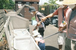 ・小雨や暑い日もありましたが、丁寧に公園の見回りや美化活動を行いました。公園利用者に挨拶など声がけをしつつ、花火や水風船の小さなゴミも拾いました。