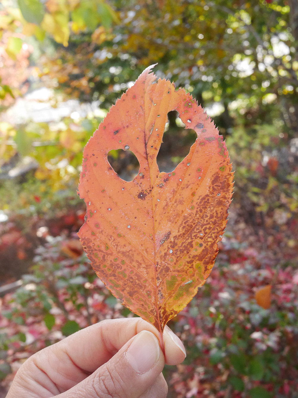 以前も紹介のありましたオオシマザクラ。ずいぶん葉っぱが落ちてきましたが、穴あき葉っぱをさがすのも楽しいです。