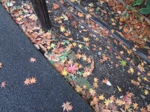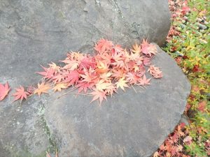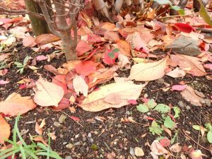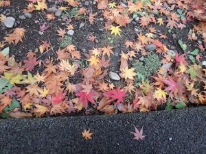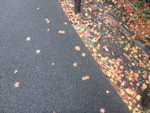 園路には落葉したイロハモミジなどのカエデ類の葉が点、点、点。