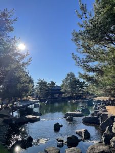 帰真園の水面もきらきら光っていました。クロマツとアカマツのマツボックリもたくさんついています。