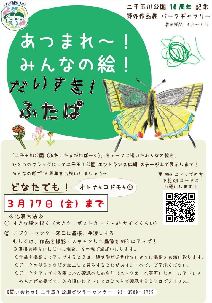 二子玉川公園は4月に10周年を迎えます!そこで「二子玉川公園」をテーマに描いてもらった皆さんの絵を集め、期間限定で園内に展示します。詳細は下記をご確認ください。