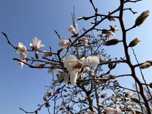 青空に白い色とうすいピンク色が映える「モクレン」。