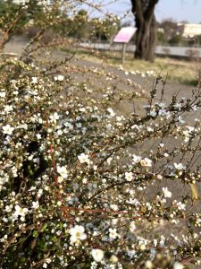 ひゅっと線上に伸びた細い枝に、たくさんの小さい白い花が咲いています。