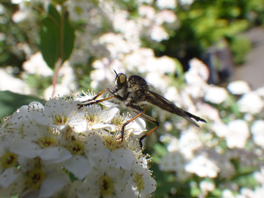 肉食のムシヒキアブの仲間で他の虫を捕らえて体液を吸います。
