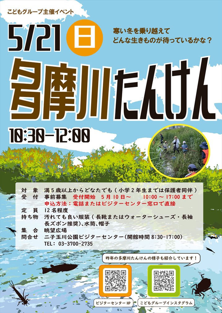 【受付終了しました!】5月21日(日)こどもグループ主催「多摩川たんけん」 Tweet 5月21日(土)実施予定のこどもグループ主催イベント「多摩川たんけん」は 定員に達したため、受付を終了致しました。 お申込み頂きました皆様ありがとうございました。