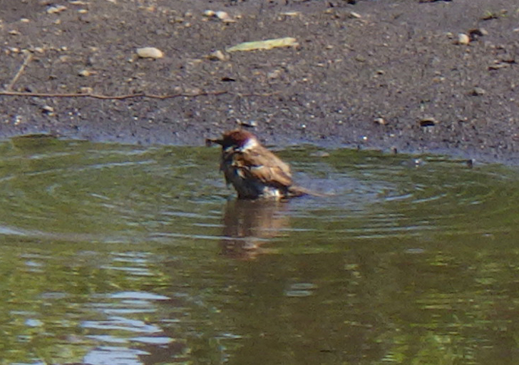 雨あがりの水たまりで スズメが水浴びをしていました。