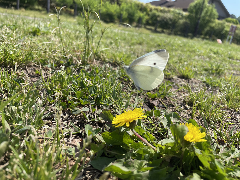 草広場のセイヨウタンポポには、たくさんのモンシロチョウが来ていました。