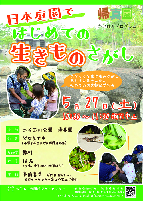 受付終了【5月帰真園イベント】日本庭園ではじめての生きものさがし Tweet ビジターセンタースタッフと一緒に、 日本庭園で生きものさがしをしてみませんか。初めての方も大歓迎です★ 〇日時:2023年5月27日(土)10:30~11:30 ※雨天中止 〇対象:どなたでも(小学2年生以下は保護者同伴) 〇集合:ビジターセンター 〇受付:5/19(金)10:00~、お電話か直接ビジターセンターまで 〇定員:10名(先着順) 定員に達したため受付終了しました。