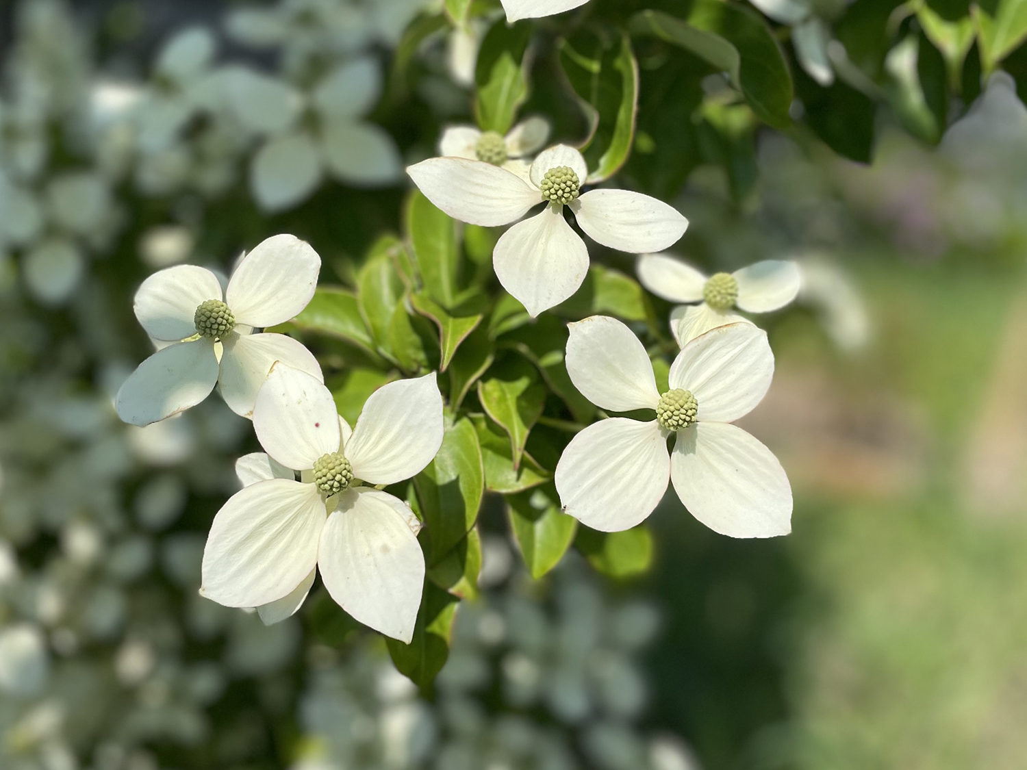 常緑ヤマボウシが咲いていました。真ん中の丸いところが花で、白い花のようなところは花のつけ根の葉(総苞片)です。合わせて綺麗ですね。