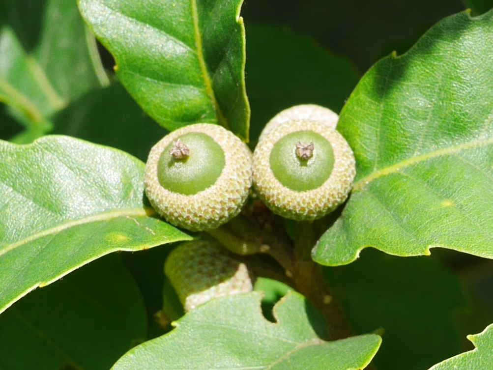 コナラの実がだんだん大きくふくらんで、帽子からちょっぴり中が見えてきました。季節が進むとだんだん大きくなり、「どんぐり」の形になってきます。