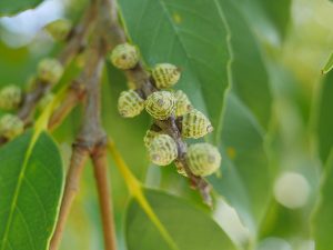 目を引く大きなスダジイも小さなしましまの実をつけ始めました。秋に実ると食べてもおいしいどんぐりの仲間です。