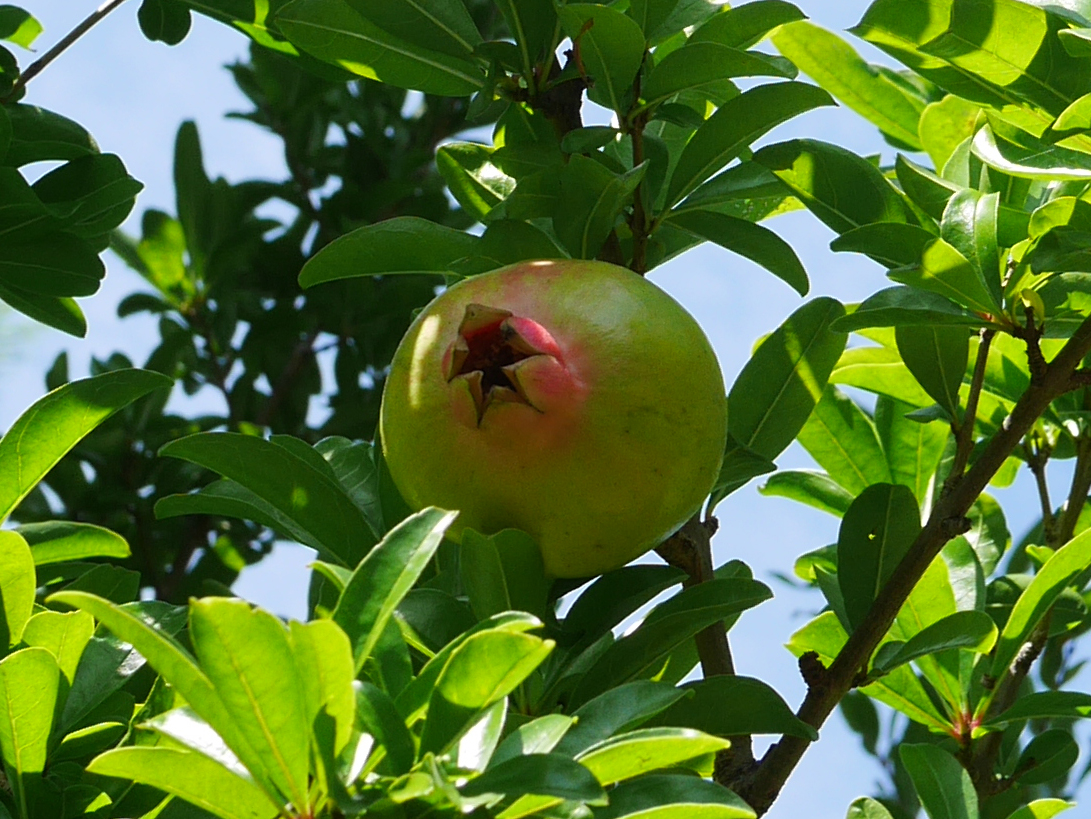 ザクロが実をつけていました。鮮やかな赤色の花が終わるとできる実、これからだんだん色づいていきます。