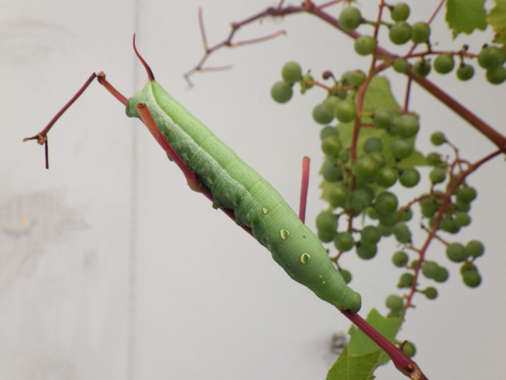 最近は、コスズメの幼虫が柔らかい葉っぱを食べに来ています。
