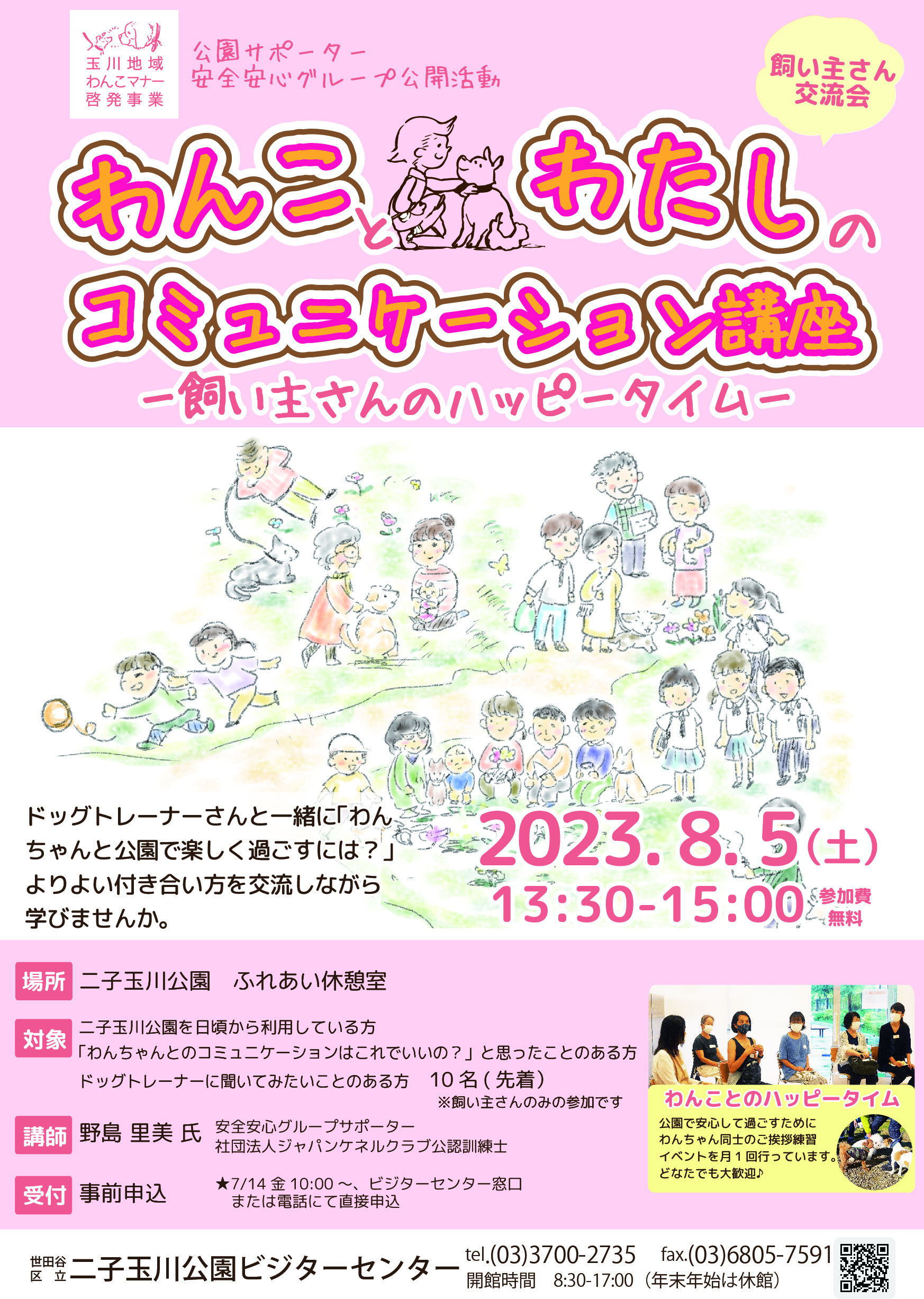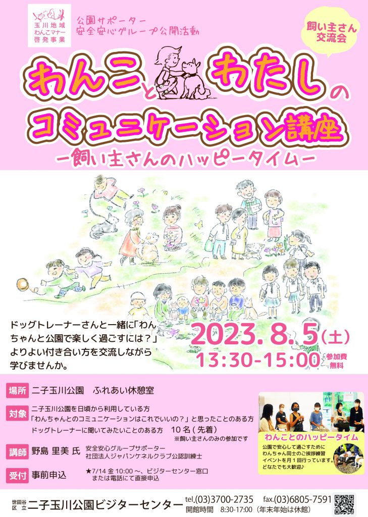 安全安心グループ公開活動、8月のわんことのハッピータイムは「わんことわたしのコミュニケーション講座 ~飼い主さんのハッピータイム~ 」を実施します。