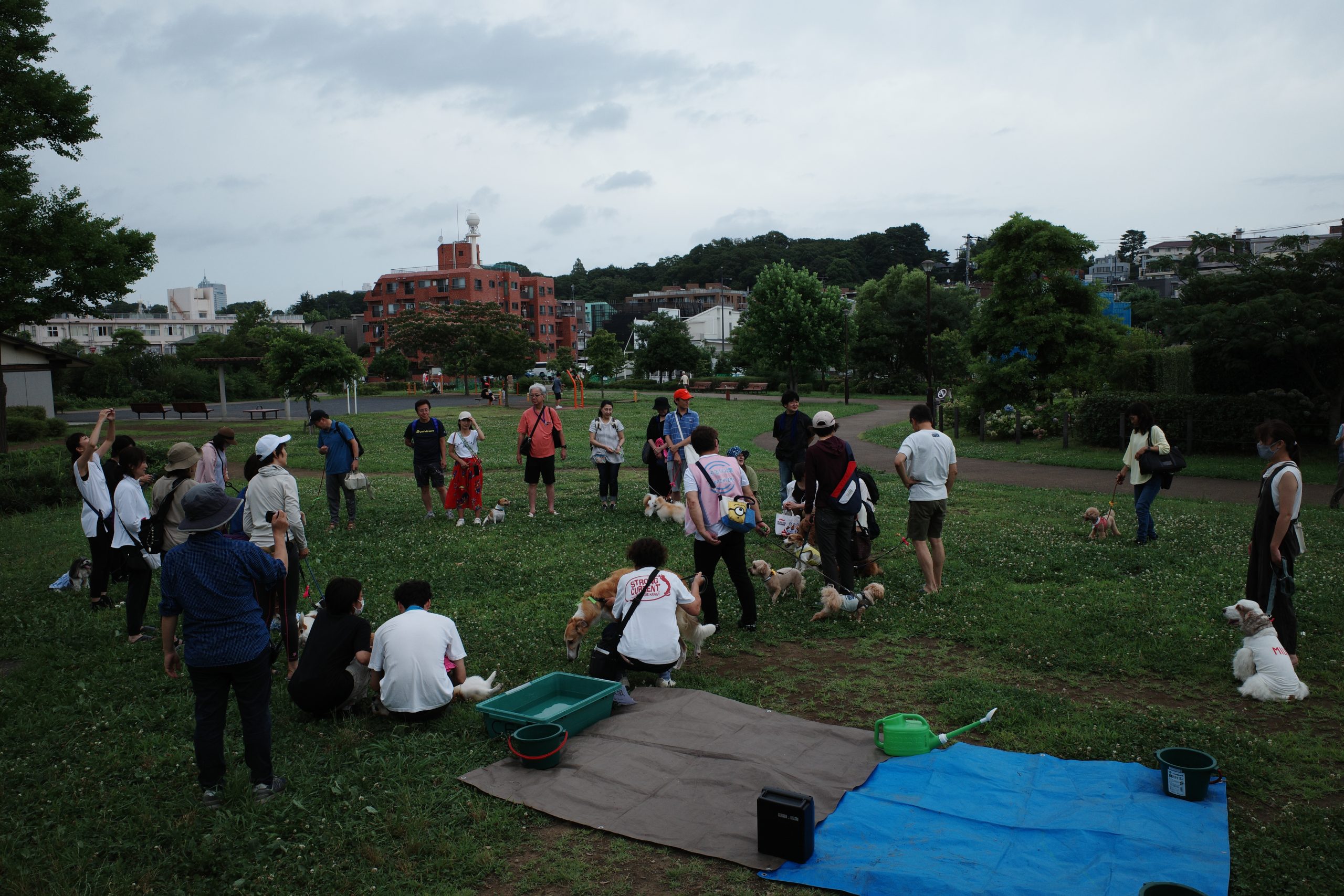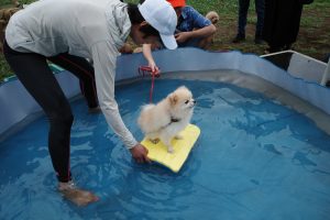 ・暑い7月は特別編「水遊び」。4年ぶり2回目のイベントとなりましたが、サポーターの皆さんが設営・実施・片づけまでご一緒くださり、無事に実施できました。わんちゃん同士のご挨拶練習をしてから、水あそび開始。初めてでビート板を見事乗りこなしたわんちゃんもいて、和やかな雰囲気の中で公園の利用者の方との交流も楽しみました。