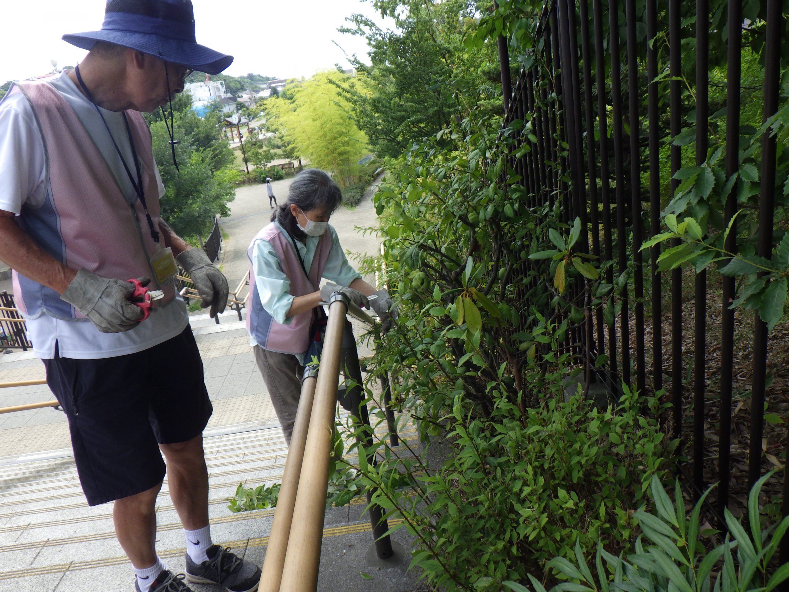 蒸し暑い日でしたが、手すりのゆるみチェックと、階段に出てしまっている植物の剪定を行いました。ボケのトゲはかなり鋭いため、皮手袋をはめて活動しました。また、園内の美化活動も行いました。安全安心グループに所属していたご家族との嬉しい再会もあり、とても賑やかな活動となりました。今後も無理せず楽しく元気よく、活動を続けて行きたいと思います。9月には活動を気軽に体験できる体験会も予定しています。みなさんの参加をお待ちしています。