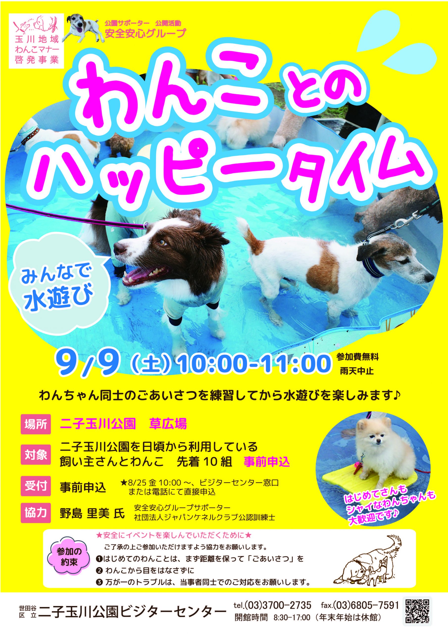 9/9わんことのハッピータイムみんなで水遊び実施します! Tweet 9月のわんことのハッピータイムはみんなで水遊び!ごあいさつの練習をしながら、プールに入ったり、シャワーを浴びたり、涼みながらワンちゃん同士の交流や、飼い主さん同士の交流をしてみませんか? 「人もわんこも心地よく過ごせる公園であり続けること」を目指して、公園サポーター「安全安心グループ」が実施するイベントです。 事前申込制ですので、ポスターをご覧の上(ポスター下部の参加のお約束とご挨拶カードもご確認ください)、お申し込みお待ちしております。