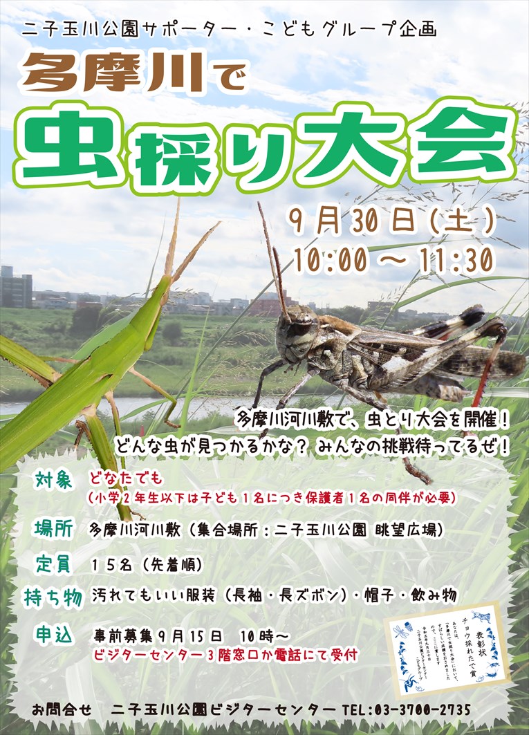 眺望広場(受付・観察)、多摩川河川敷(虫採り)