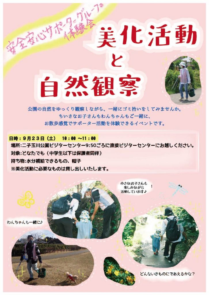【安全安心グループ体験会】美化活動と自然観察のご案内 Tweet 二子玉川公園のサポーターグループ「安全安心グループ」の活動体験会です。 ご一緒に公園を歩きながら、自然観察とゴミ拾いの充実の1時間です。 わんちゃんお散歩の方もお待ちしています。