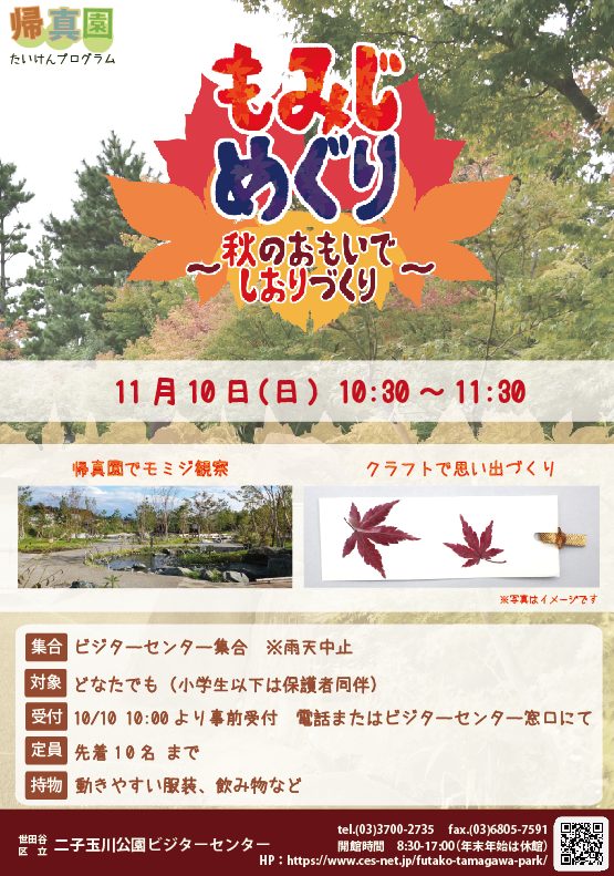帰真園で一緒にモミジ観察してみませんか?最後にはモミジの葉っぱを使った「しおり」づくりをして、思い出にしましょう♪
