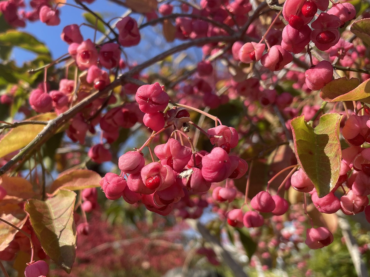 愛らしい濃いピンク色に色づいて、中から赤い実がのぞいているのはマユミです。冬にかけても赤い実は残るので、ぜひ探してみてくださいね。