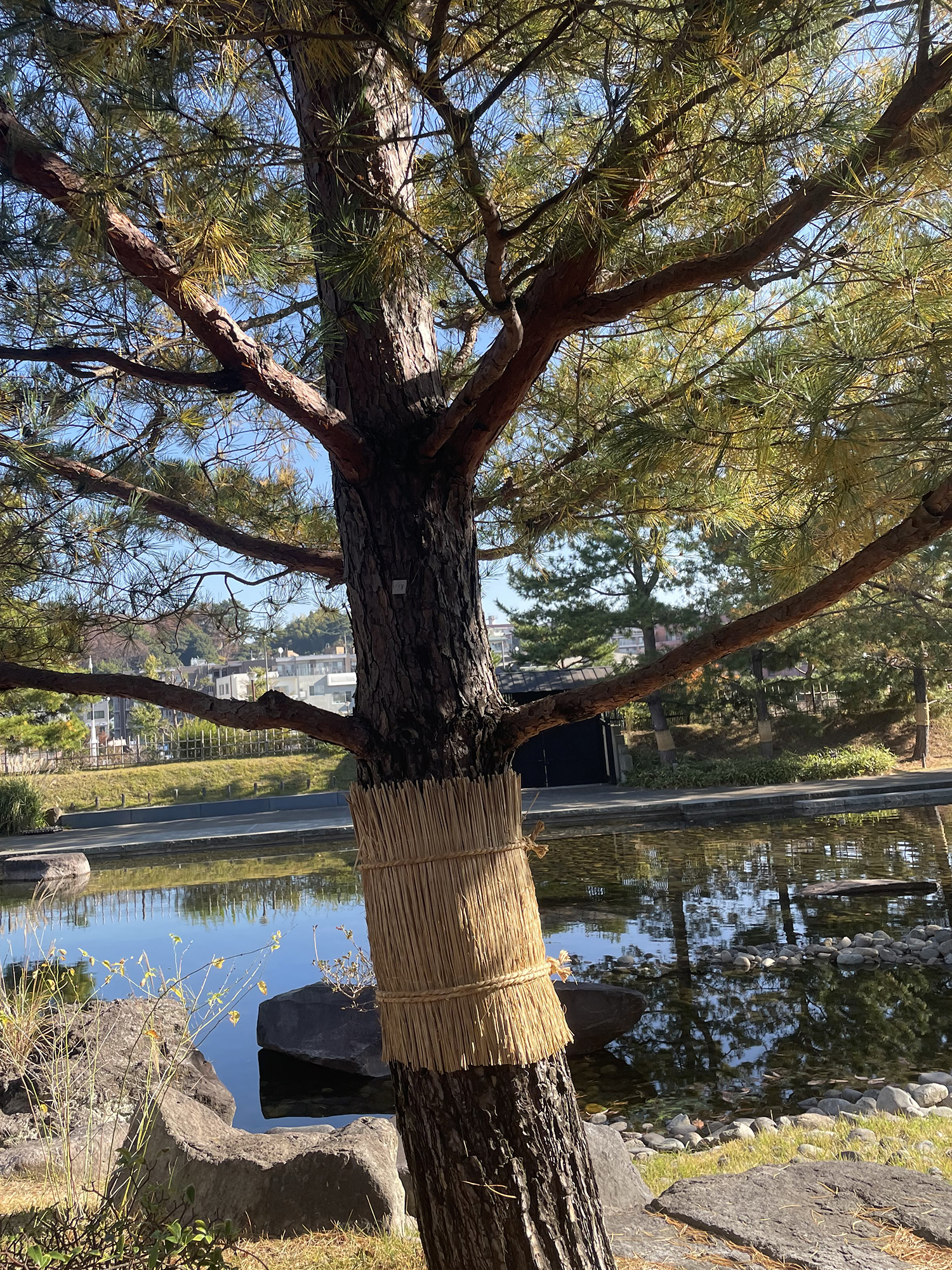 こちらも冬じたく「マツのこも巻き」です。まるで腹巻きのようにも見えますが、害虫からマツを守るための昔からの方法です。帰真園では毎年秋にマツの木に巻いているので、こも巻きをみると冬の訪れを感じます。