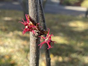 花火のような紅色のこちらはマルバノキの花です。晩秋にかけて、葉の落ちる頃に咲くこの植物、葉っぱの形から「マルバノキ」と名前がつきましたが、花も印象的な形です。