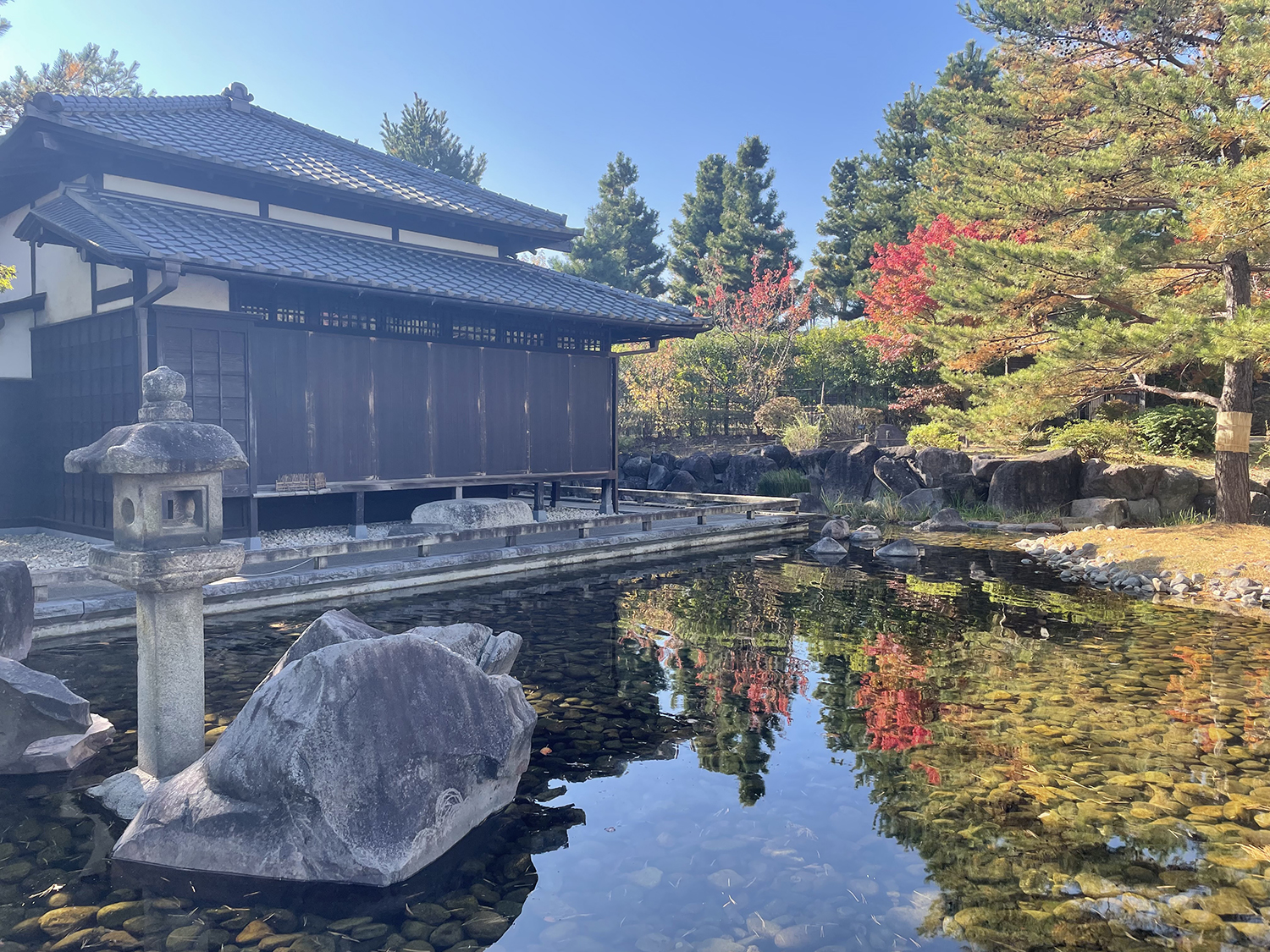 帰真園も紅葉がぐんと進み、色づいた葉が水面にうつり綺麗です。