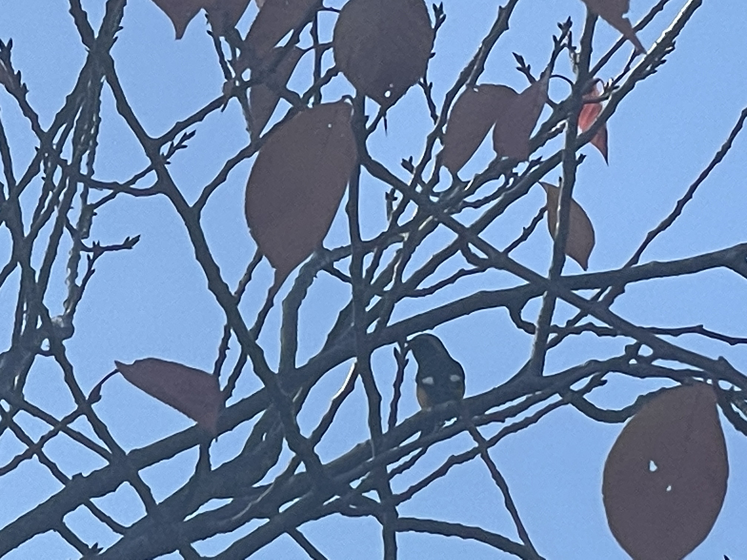 あれ!サクラの木の枝に止まっているのは冬鳥のジョウビタキ。葉が落ちるこれからの季節は、帰真園で野鳥に出会いやすくなってきます。おすすめは朝いちばん、あたたかい服装でお越しくださいね。