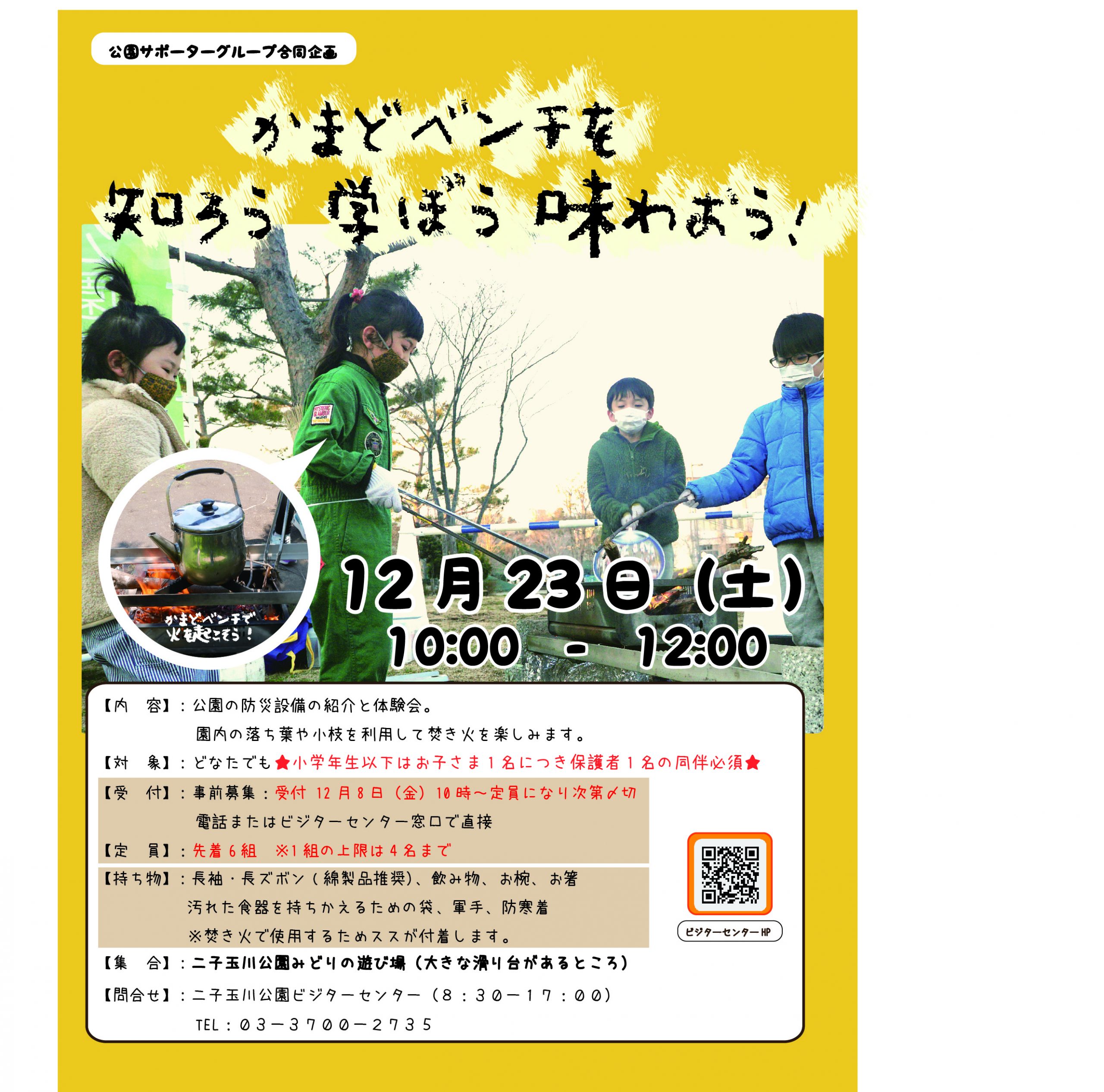 園内にある防災設備の使用体験として、園内の落ち葉や小枝を利用して火を起こし、食べ物の調理を体験します。年の最後、皆でぽかぽかあたたまりましょう。ご参加申し込みお待ちしています♪