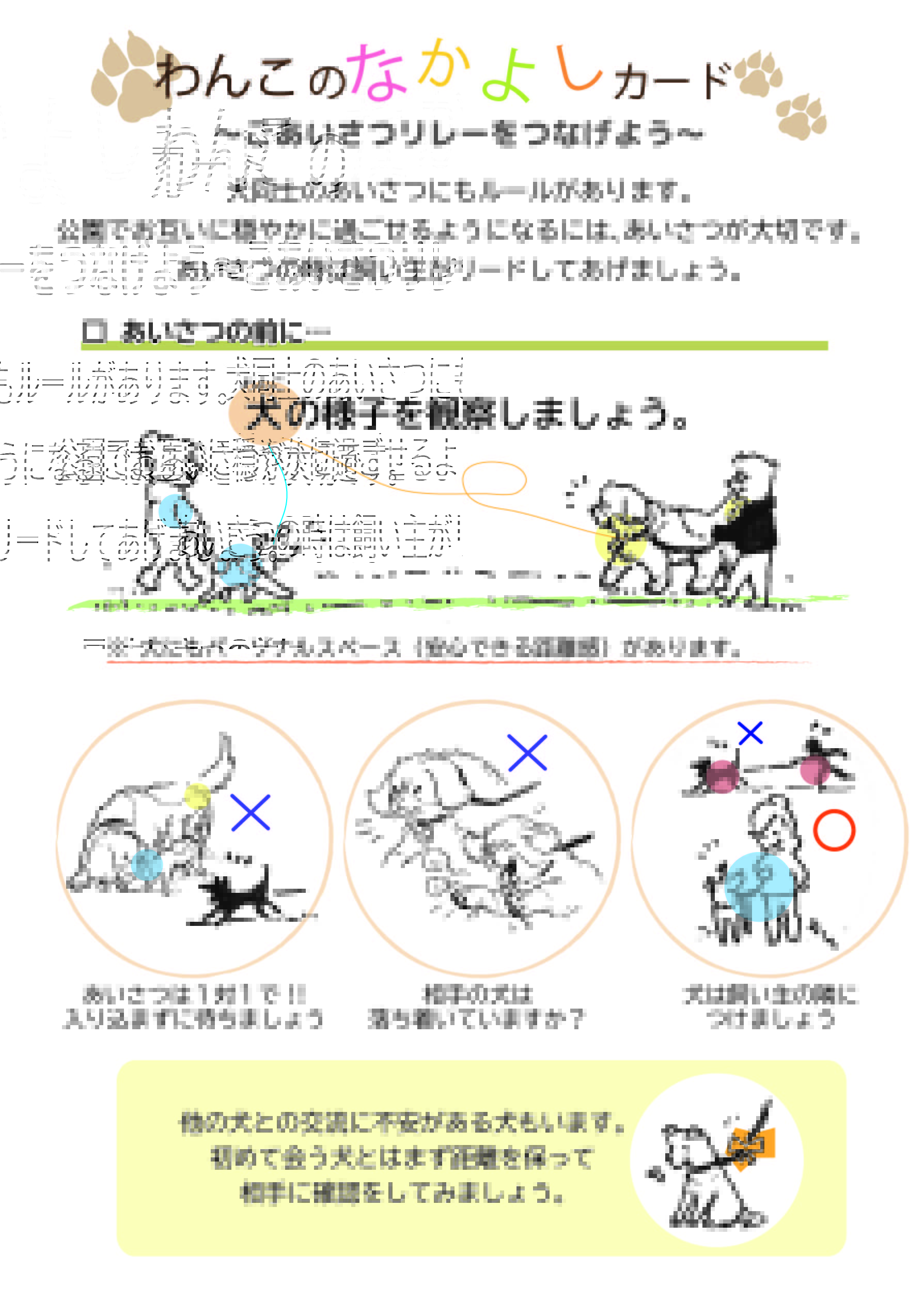 ※ご参加の際は、事前に下の「なかよしカード」でわんこ同士のご挨拶や飼い主さんとのやり取りの仕方をご確認下さい。