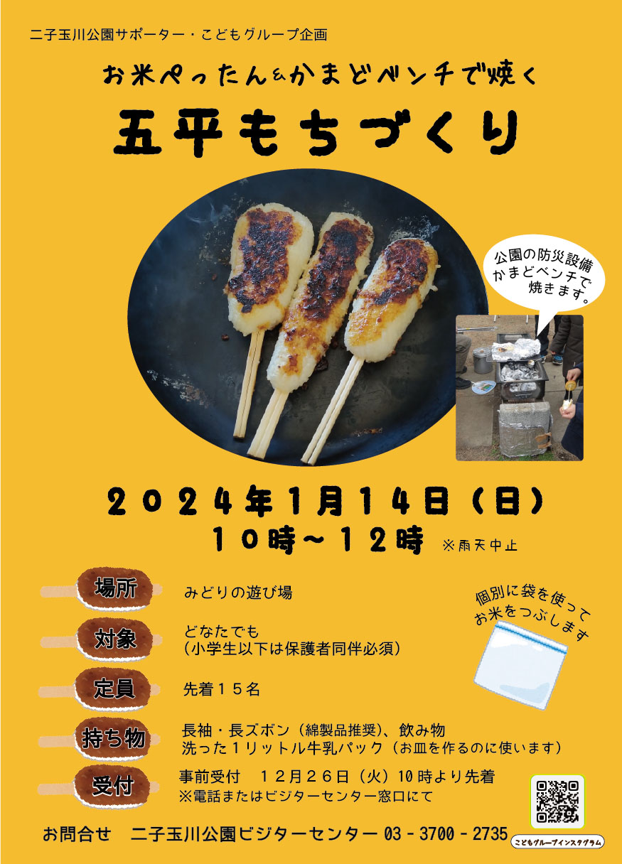 公園の防災設備「かまどベンチ」を使って、五平もちを手作りしよう!