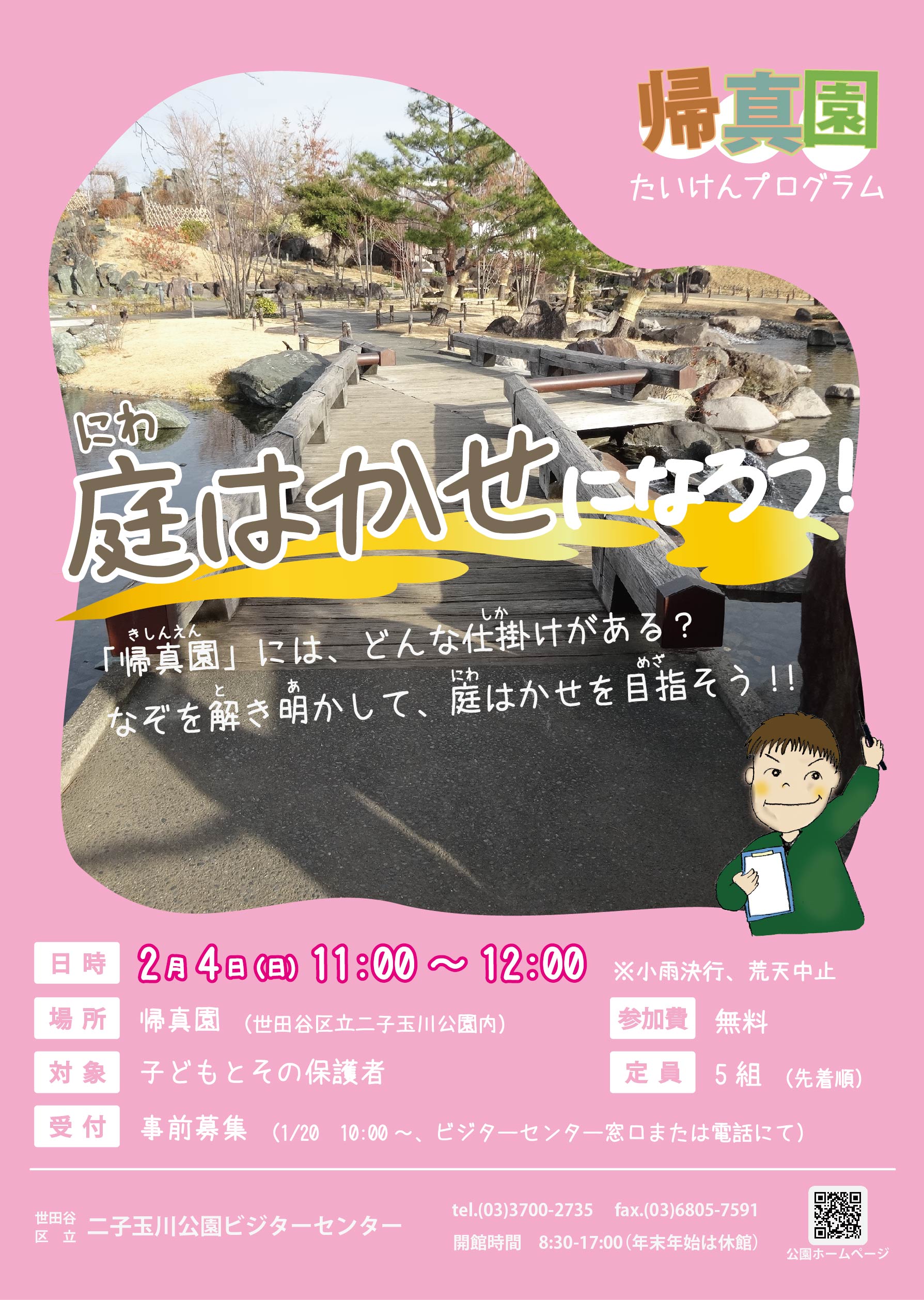 まだ空きあります!【帰真園体験プログラム】2/4(日)庭はかせになろう! Tweet 帰真園には、どんな仕掛けがあるでしょう?帰真園のデザインを解き明かしながら、「庭はかせ」を目指しませんか? 日時 2024年2月4日(日) 11:00~12:00 ※小雨決行、荒天中止 場所 帰真園 ※開始5分前にビジターセンター(3階)にお集まりください 対象 子どもとその保護者 ※年齢に制限はありません 定員 5組(先着順) 申込 1月20日(土)10時より電話もしくは窓口にて 二子玉川公園ビジターセンター 03-3700-2735開館時間:8:30~17:00