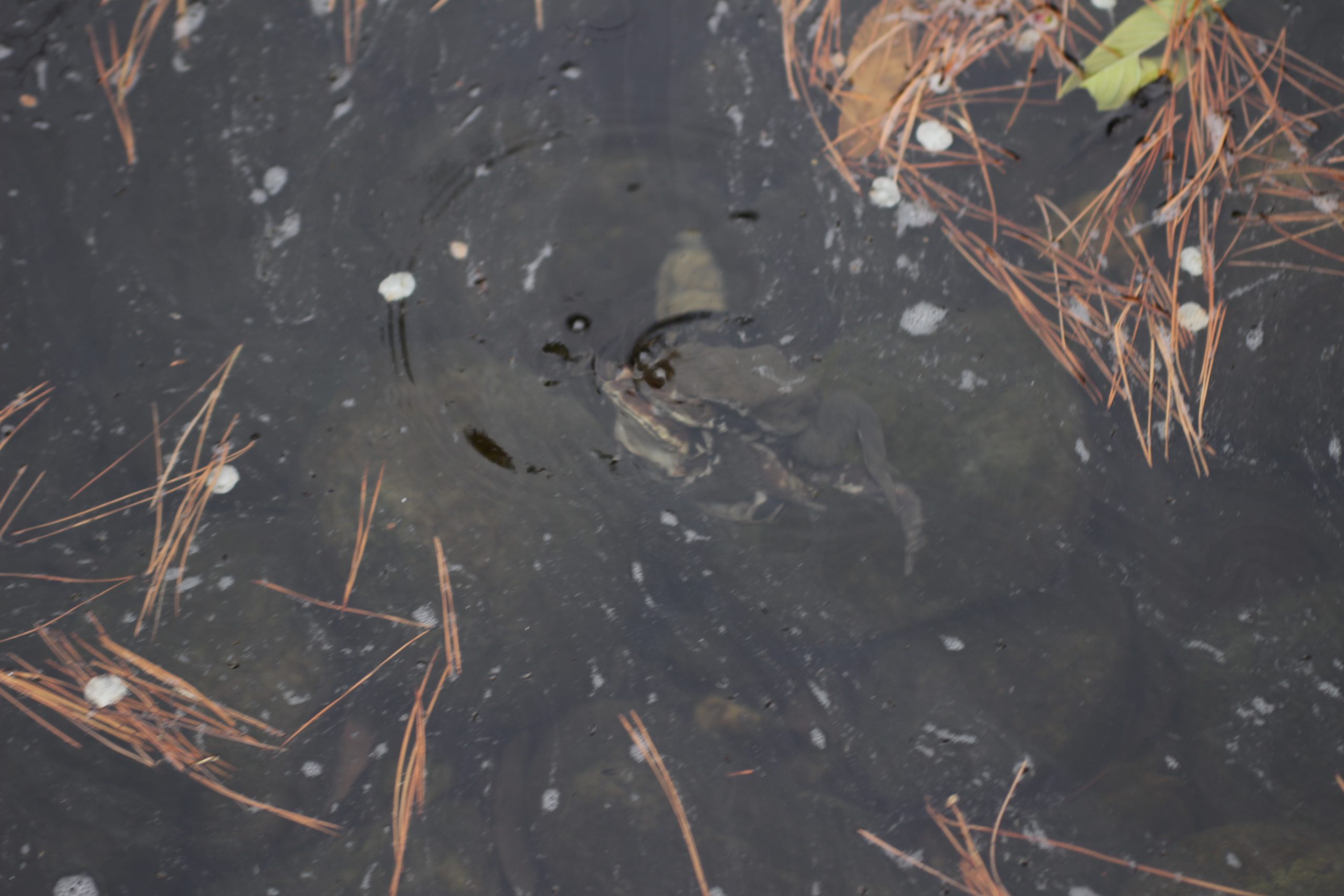 水面を見つけてもなかなか見つからず、しばらくじっくり探すと、いましたいました!カエルたち。公園周辺からこの時期になると一斉に集まり、ペアになって卵を産みます。今回は13匹確認することが出来ました。卵紐も見られはじました。