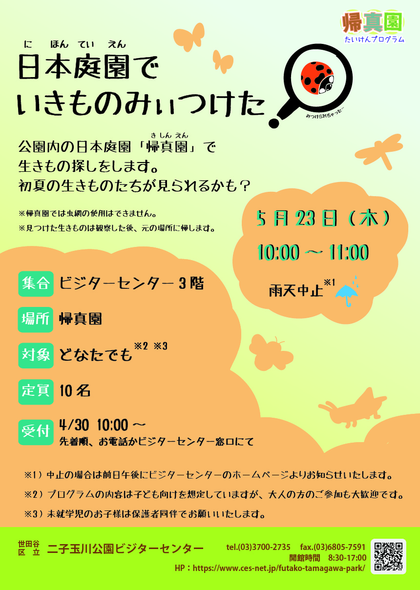 【5/23帰真園体験プログラム】『日本庭園でいきものみぃつけた!』申込受付中 Tweet 公園内の日本庭園「帰真園」で初夏の生きものを探して観察しよう! 日時 2024年5月23日(土) 10:00~11:00 ※雨天中止(中止の場合はホームページよりお知らせ) 場所 帰真園 対象 どなたでも(未就学児は保護者同伴) ※内容は子ども向けですが、大人の方の参加も大歓迎です。 定員 10名(先着順) 申込 4月30日(火)10時より電話もしくは窓口にて 世田谷区立 二子玉川公園ビジターセンターTEL:03-3700-2735開館時間:8:30~17:00