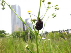 他によく見れたのが、キマダラカメムシです。こちらも江戸時代頃に入ってきた外来種といわれています。画像をよく見ると卵を産んでいます!この虫は近年数が増えているそうです。大きめのカメムシなので、よく見かける方もいらっしゃるのではないでしょうか。