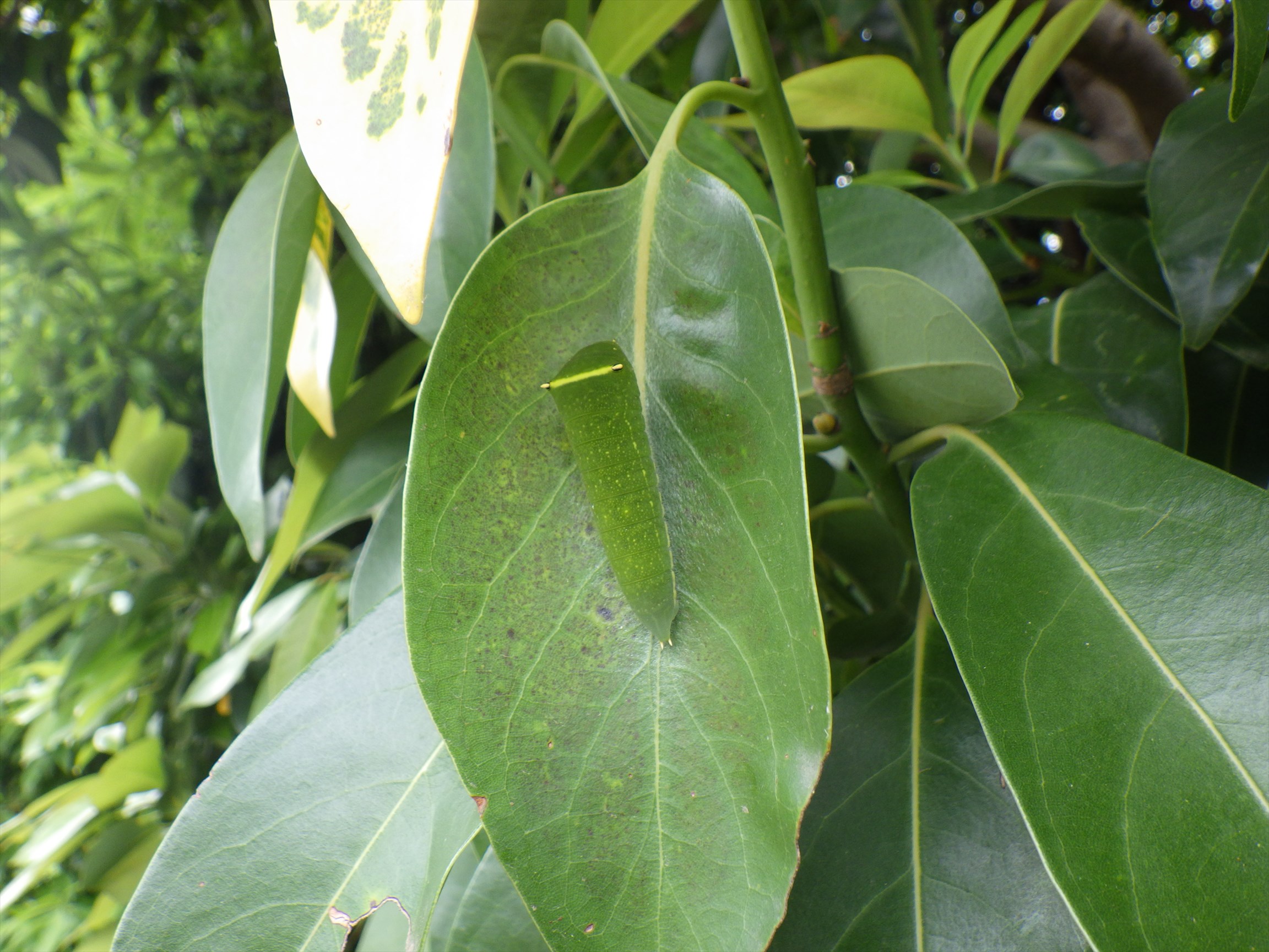 画像の葉の真ん中に緑色の幼虫がいるのがおわかりでしょうか。