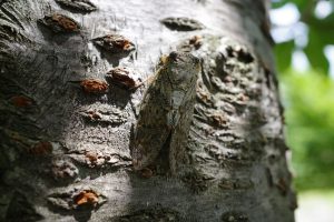 ニイニイゼミです。小さく、かつ桜の樹皮のうすい灰色にそっくりな色、翅の模様です。よく耳を澄ませて、声の聞こえる方にそっと近づいてよ~く探してみると、見つけられるかもしれません。