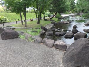 視界の端で、なにやら小さな生き物が池に飛び込むのが見えました。