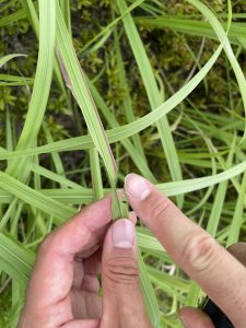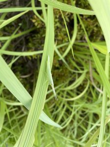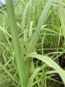 イネ科の中でもチガヤを好んでいて、飛ぶより葉っぱに隠れるのが得意なバッタです。背中の筋の色はチガヤにそっくり。チガヤはエサと隠れ場所、両方にぴったりです。