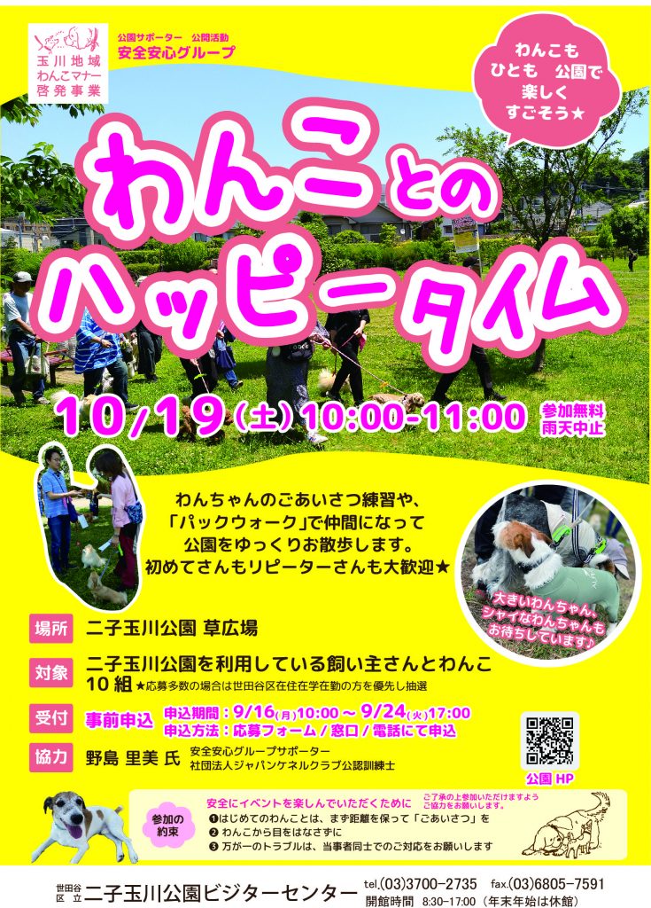安全安心グループのわんちゃんマナー啓発イベント「わんことのハッピータイム」を実施しますのでご案内いたします。公園がだれもが安心して笑顔で過ごせる公園でありますように、という願いをこめて、わんちゃん同士のコミュニケーション練習や飼い主さん同士の交流を行うイベントです。