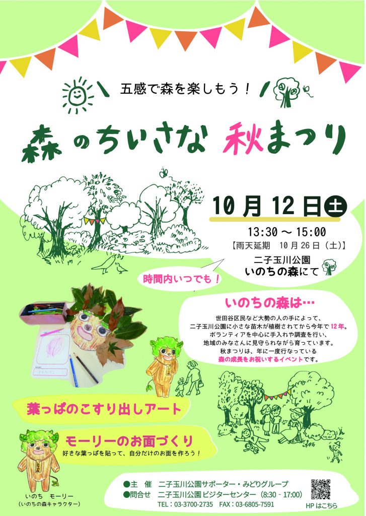 【内 容】いのちの森にて「葉っぱのこすり出しアート」「モーリーのお面づくり」を行います。五感を使って好きな葉っぱを集めて工作しよう!どんぐりも拾えるかも?