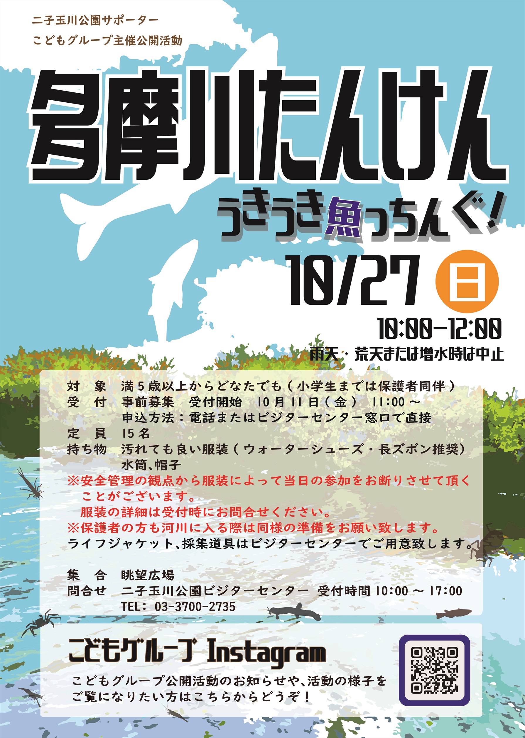 二子玉川公園前の多摩川で水生生物の採集と観察を実施致します