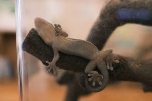 ニホンヤモリの手にはとても細かい毛が生えているので、こうして壁にくっつくことも楽々。すごいですね。